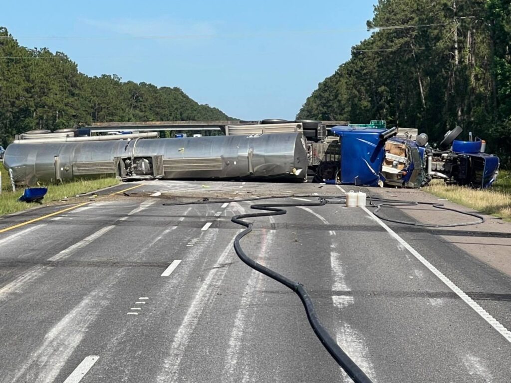 An 18 wheeler carrying isopropyl alcohol overturned. There was a small leak but authorities brought that under control. The interstate was completely shut down for a period of time so drivers were asked to avoid the area and other roads along the Northshore quickly backed up with the additional traffic.