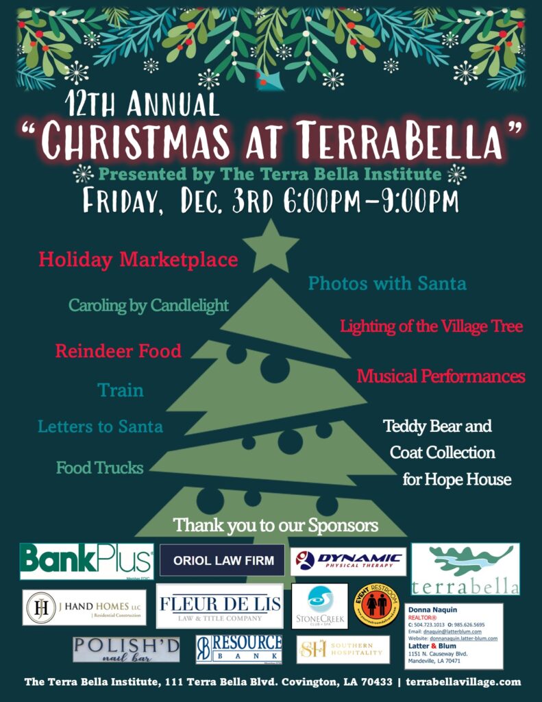 The 12th Annual “Christmas at TerraBella” Lighting of the Village Tree and Holiday Marketplace will be Friday, December 3rd from 6pm-9pm at TerraBella Village in Covington.