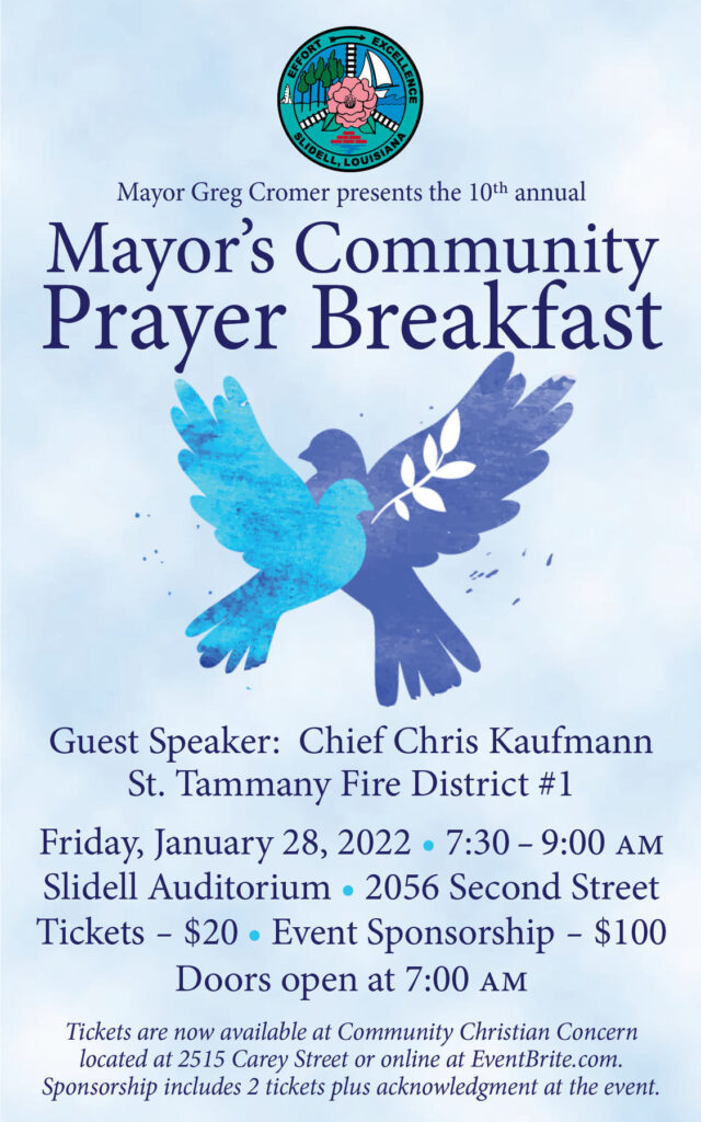 Slidell Mayor Greg Cromer is inviting the public to join him for the Mayor’s Community Prayer Breakfast, presented by Community Christian Concern, on Friday, January 28, 2022, at 7:30 a.m. in the Slidell Municipal Auditorium.