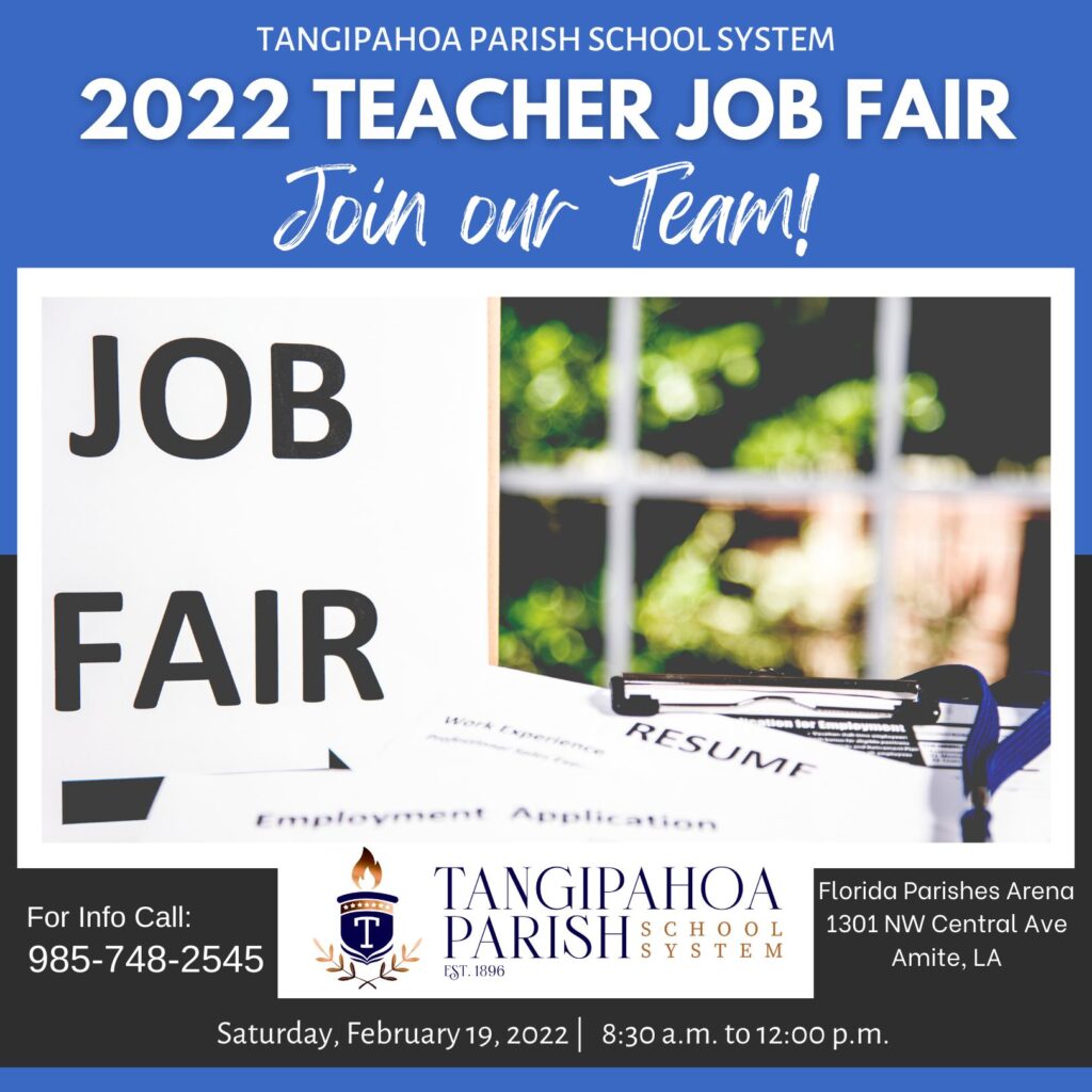 The Tangipahoa Parish School System is having their 2022 Teacher Job Fair on Saturday, February 19, from 8:30 until Noon.
