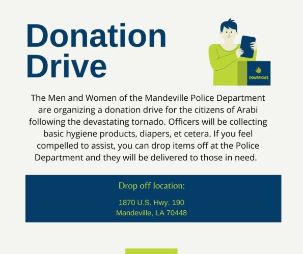 The Mandeville Police Department has set up a donation drive to help people affected by the tornado in Arabi.
