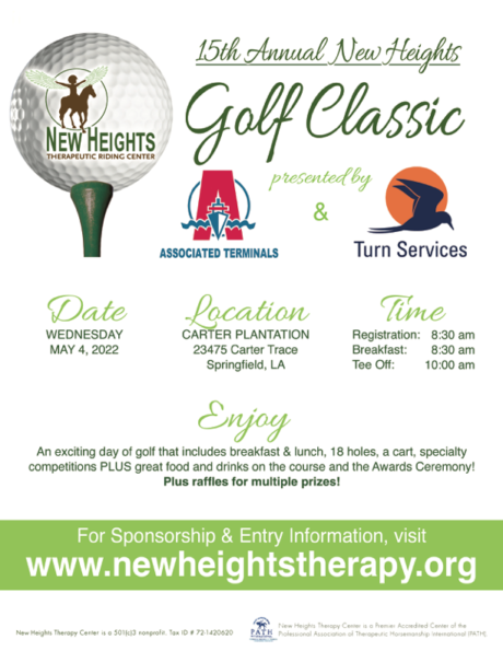 The 15th Annual New Heights Therapeutic Riding Center Golf Classic will be held at Carter Plantation in Springfield on May 4th.