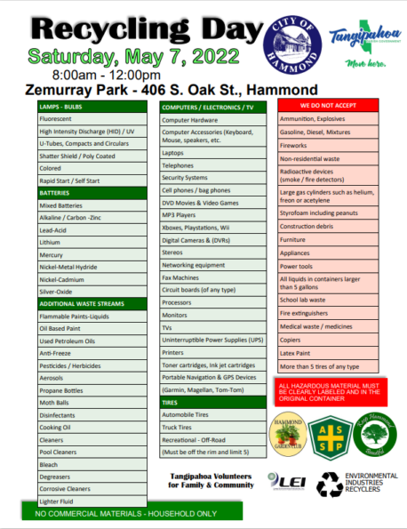 The City of Hammond and Tangipahoa Parish Government are hosting a Recycling Day on Saturday, May 7 from 8 am until Noon at Zemurray Park at 406 Oak Street in Hammond.