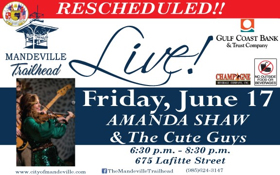 Due to the weather forecast the Mandeville Live Free Friday Concert Series for Friday featuring Amanda Shaw and the Cute Guys has been rescheduled.