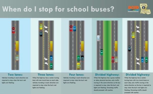 A school bus is designed to be the safest vehicle on the road, but the greatest risk to our school-age children is the loading and unloading of children at bus stops. As a reminder to motorists, all vehicular traffic must stop no less than 30 feet from a school bus when the stop signals on the bus are activated. A vehicle approaching a stopped school bus from the opposite direction does not have to stop when traffic is separated by a divided median, but must remain cautious of the children boarding or exiting the bus.