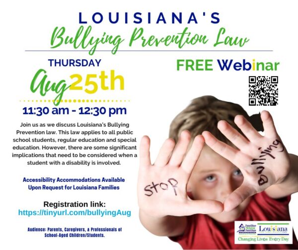 Thursday, August 25, 2022, Families Helping Families NOLA will be hosting a one-hour webinar on Louisiana’s Bullying Prevention Law.