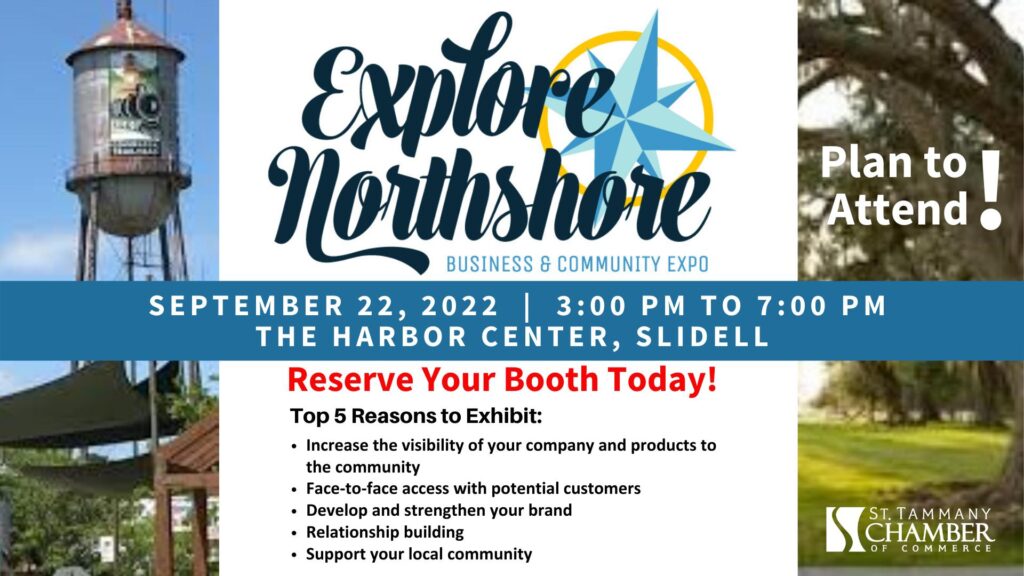 The public is invited to the St. Tammany Chamber of Commerce’s Explore Northshore: Business and Community Expo on Thursday, September 22, 2022, from 3-7 p.m. at The Harbor Center in Slidell.