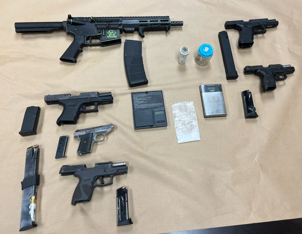Officers viewed shots being exchanged by two groups of people who began to flee in separate vehicles. One vehicle was stopped by HPD, and four subjects were detained. The second vehicle was stopped by the Louisiana State Police. Officers detained four more subjects. Six weapons and some meth were recovered.