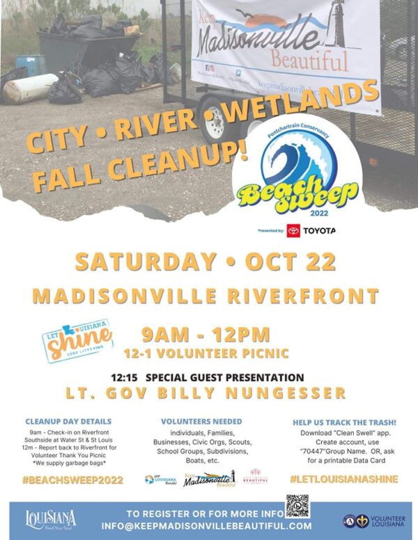 Saturday October 22 the Beach Sweep will be a city, river and wetlands fall cleanup along the Madisonville Riverfront.