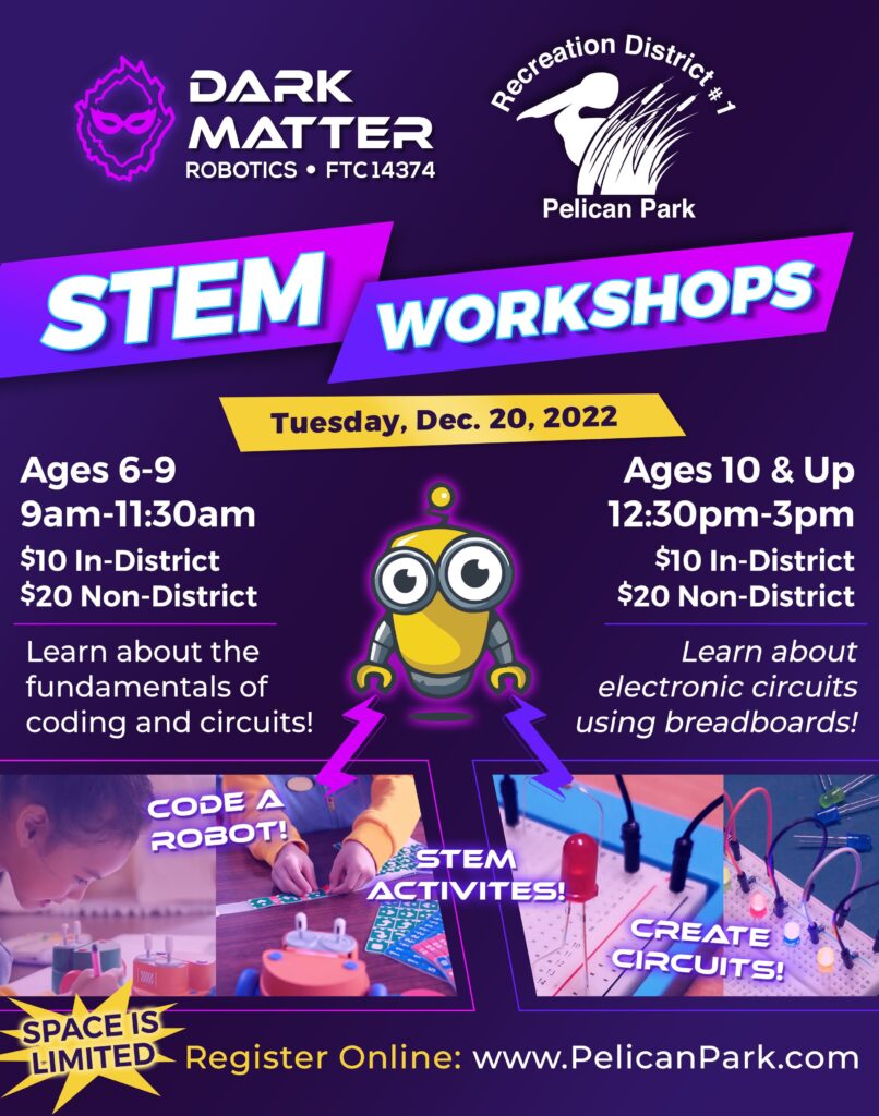 Sign up for these STEM workshops at DarkMatterRobotics.com or Pelican Park.com. They are just $10 in-district and $20 for students out of district.