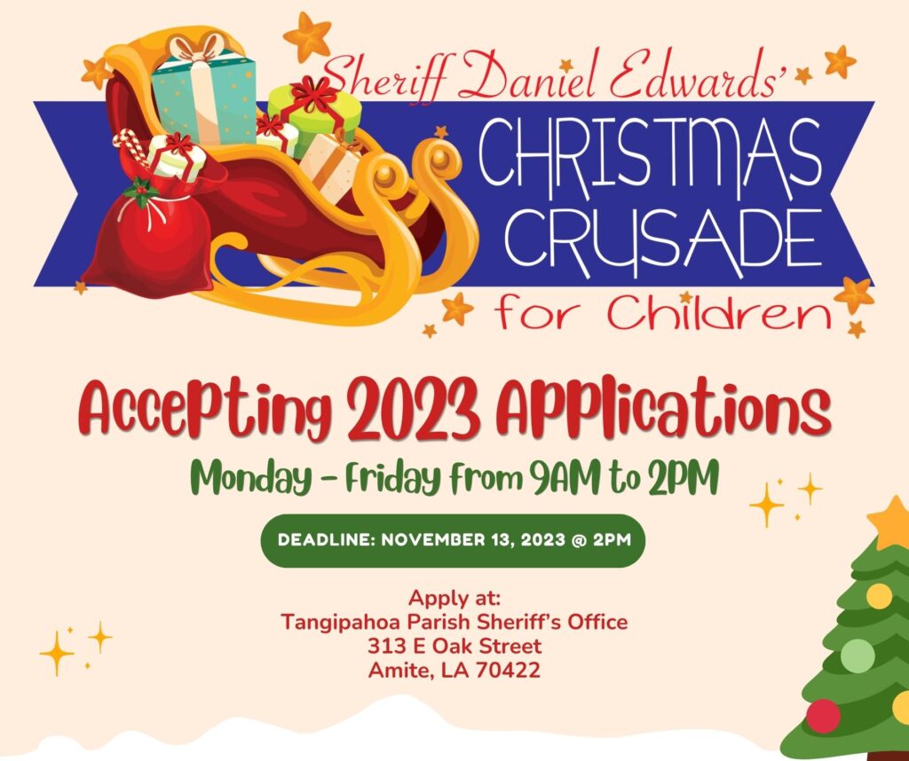 Applications must be submitted in person no later than 2 p.m., on Monday, November 13, 2023, at the Sheriff’s office in Amite, located at 313 East Oak Street. Applicants must be residents of Tangipahoa Parish, and must present a valid ID a current utility bill (gas, electric, water).