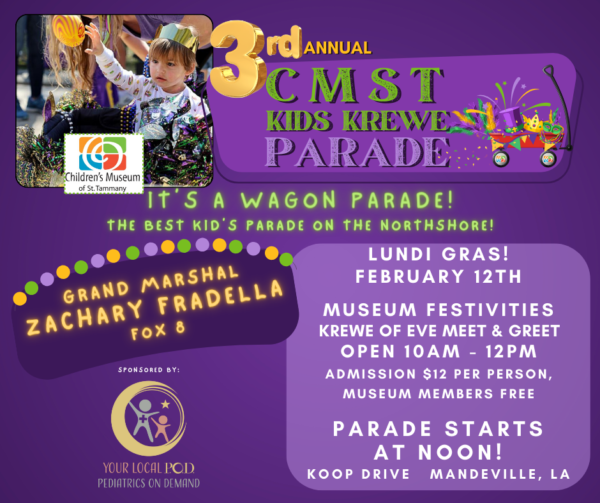 The Children’s Museum of St. Tammany (CMST) is excited to announce their 3rd Annual CMST Kids Krewe Parade and Mardi Gras Celebrations, Monday, February 12th, Lundi Gras.