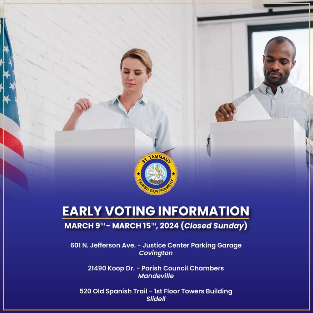 Early voting can be done at the Justice Center Parking Garage in Covington, Parish Council Chambers in Mandeville, and in the Towers Building in Slidell.