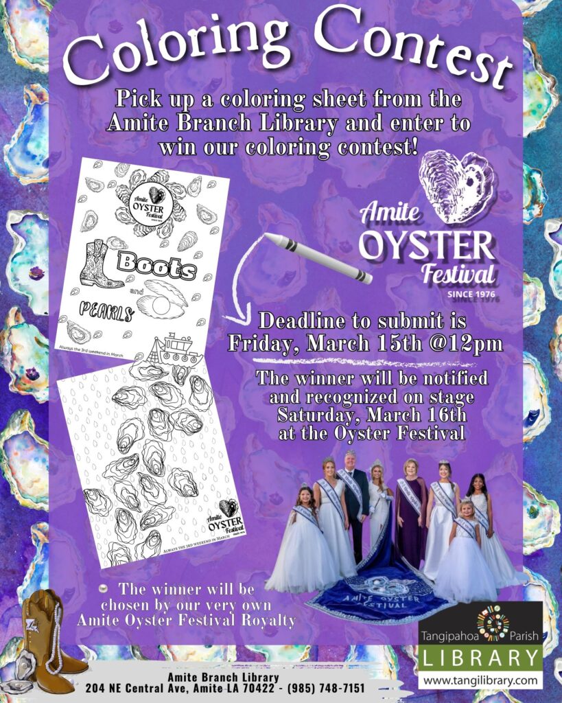 The Tangi Library says they’ll have some Amite Oyster Festival Fun ready for their patrons. Stop by their Amite Branch and be part of the Festival’s Coloring Contest.
