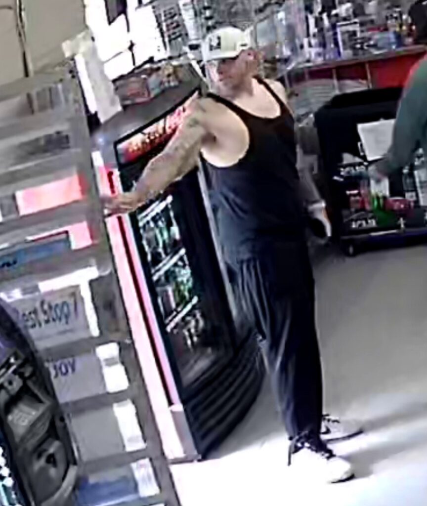 The suspect is described as having a medium build, and was seen wearing a sleeveless black tank top, black pants and light-colored shoes. The suspect also wears a baseball cap and is seen to have visible tattoos on his arms.