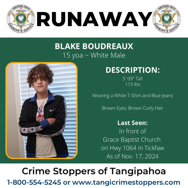 Sheriff Gerald Sticker asks anyone with information regarding Blake’s whereabouts to contact the Juvenile Division at 985-902-2031. If you’d prefer to share information anonymously, you can do so through Crime Stoppers of Tangipahoa’s tip line at 1-800-554-5245 or visit www.tangicrimestoppers.com and click on the P3 Tips icon or Submit A Tip! You may be eligible for a cash reward.