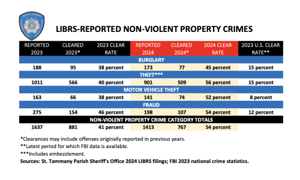 Overall, the number of violent crimes reported in unincorporated St. Tammany Parish dropped slightly, with a total of 2,562 violent crimes reported in 2024 compared to 2,786 reported in 2023. However, the total for the nationally reported categories for violent crimes remained the same at 1,149. The number of assaults reported decreased over the previous year and the number of sex offenses increased while the number of murders and robberies stayed the same. The clearance rate for those same nationally reported crime categories – murder/ manslaughter, sex offenses, robbery and assault – was 93 percent, more than twice the national average of only 41 percent.