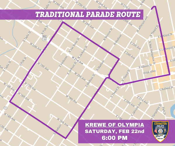 The Covington Police Department (CPD) is pleased to announce the route and safety information for the annual Krewe of Olympia Mardi Gras parade, scheduled to roll on Saturday, February 22, 2025, at 6:00 PM.